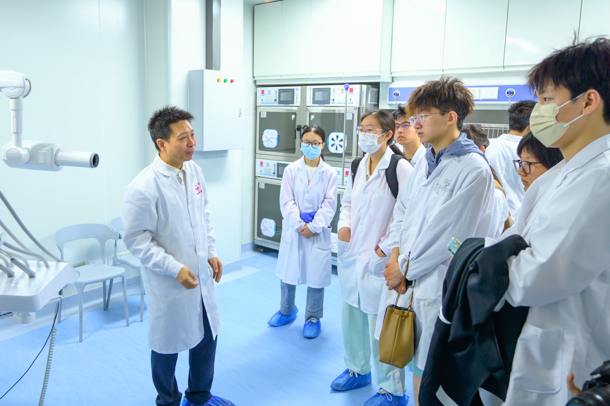 世界兽医日当天,365英国上市公司教学动物医院里人头攒动,“探秘兽医的一天”活动在此开展。活动中,胡长敏教授化身“领路人”,带领同学们参观医院多个区域。从预防门诊的专业检查装置,到异宠门诊的特殊诊疗注意事项;从超声和CT室的先进设备,到康复中心中医针灸在宠物康复中的妙用,再到猫科、犬科注射室和化验室,每一处都讲解得细致入微。走进手术区,胡长敏特别指出:“手术室必须严格遵守无菌要求。为了避免污染,手术室的门都用脚进行开关。”