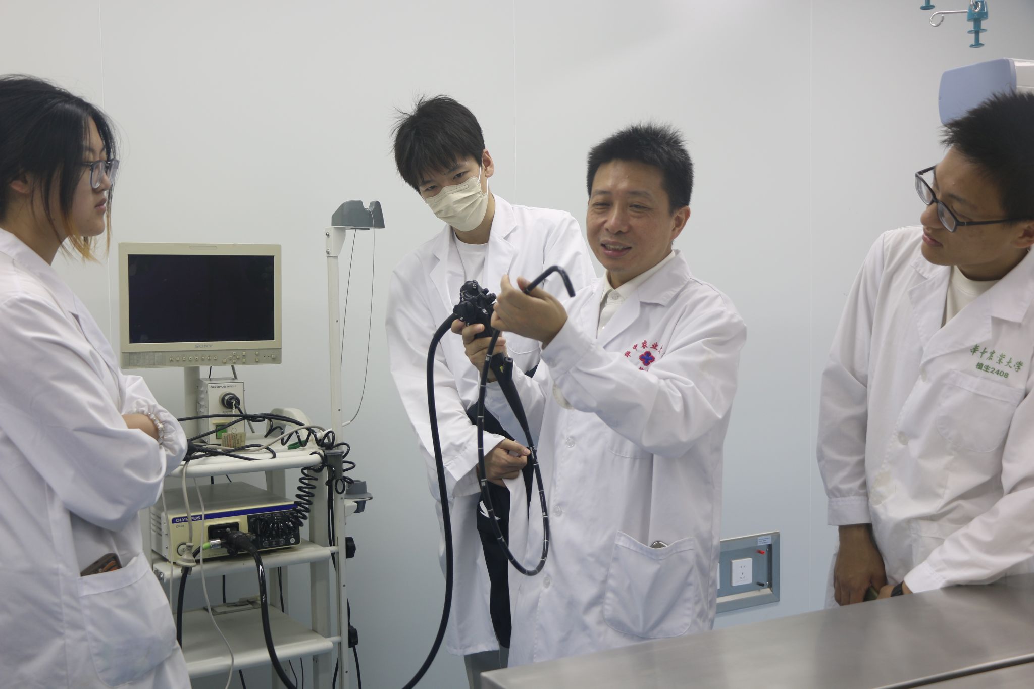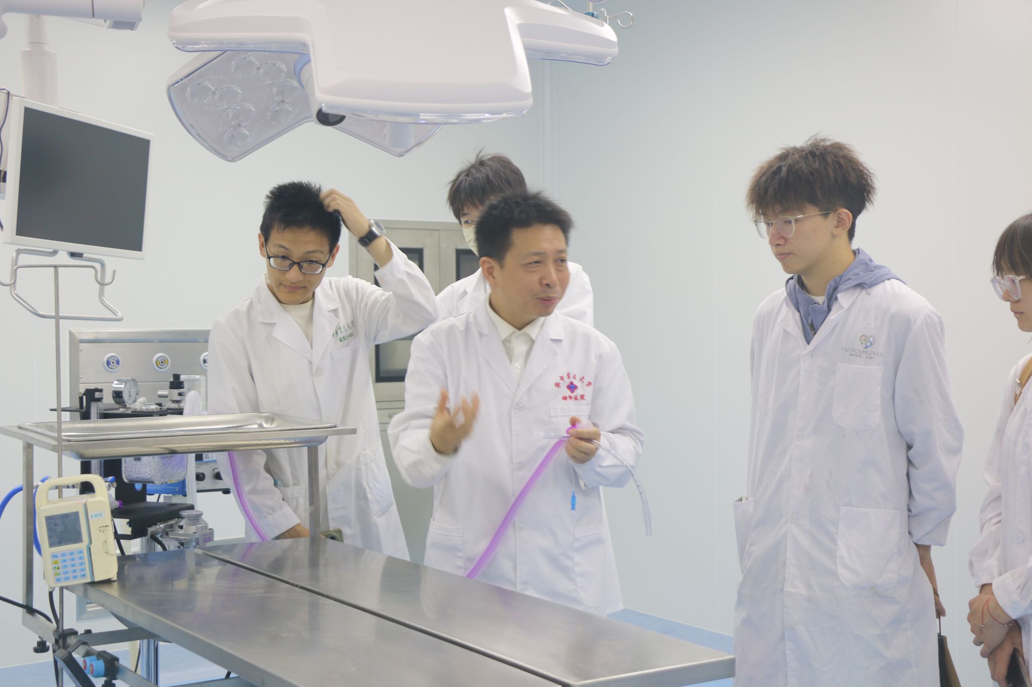 同学们走入高级手术室,参观各类手术台及外科手术仪器,胡长敏演示了麻醉机的使用、动物进行麻醉前的准备工作、气管插管大小的选择等。