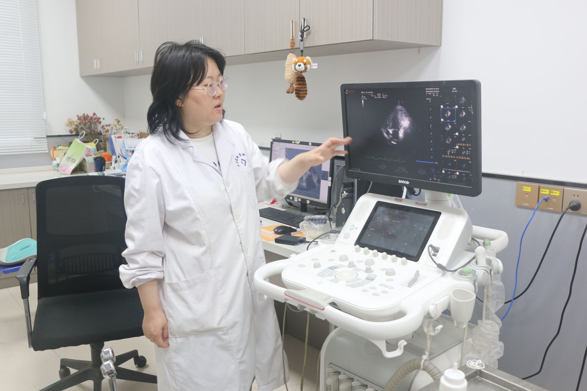 (医生在B超诊室讲解操作)