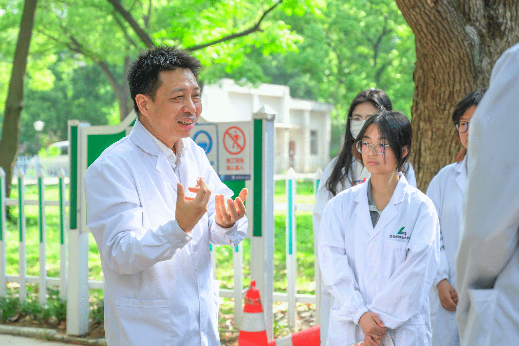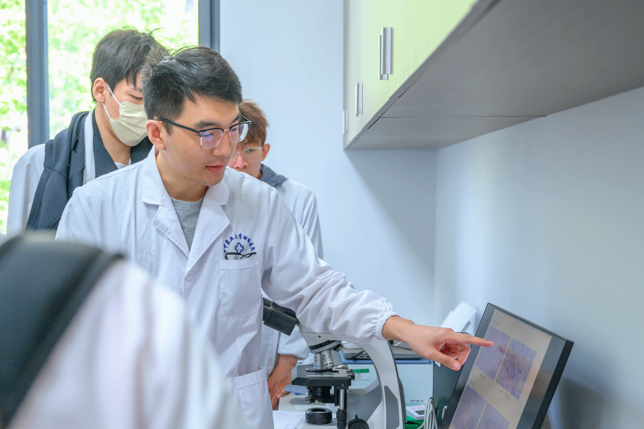 胡长敏和詹存林医生在病理处理室演示了病理样本的观察,并对积极提问的同学们进行回应。