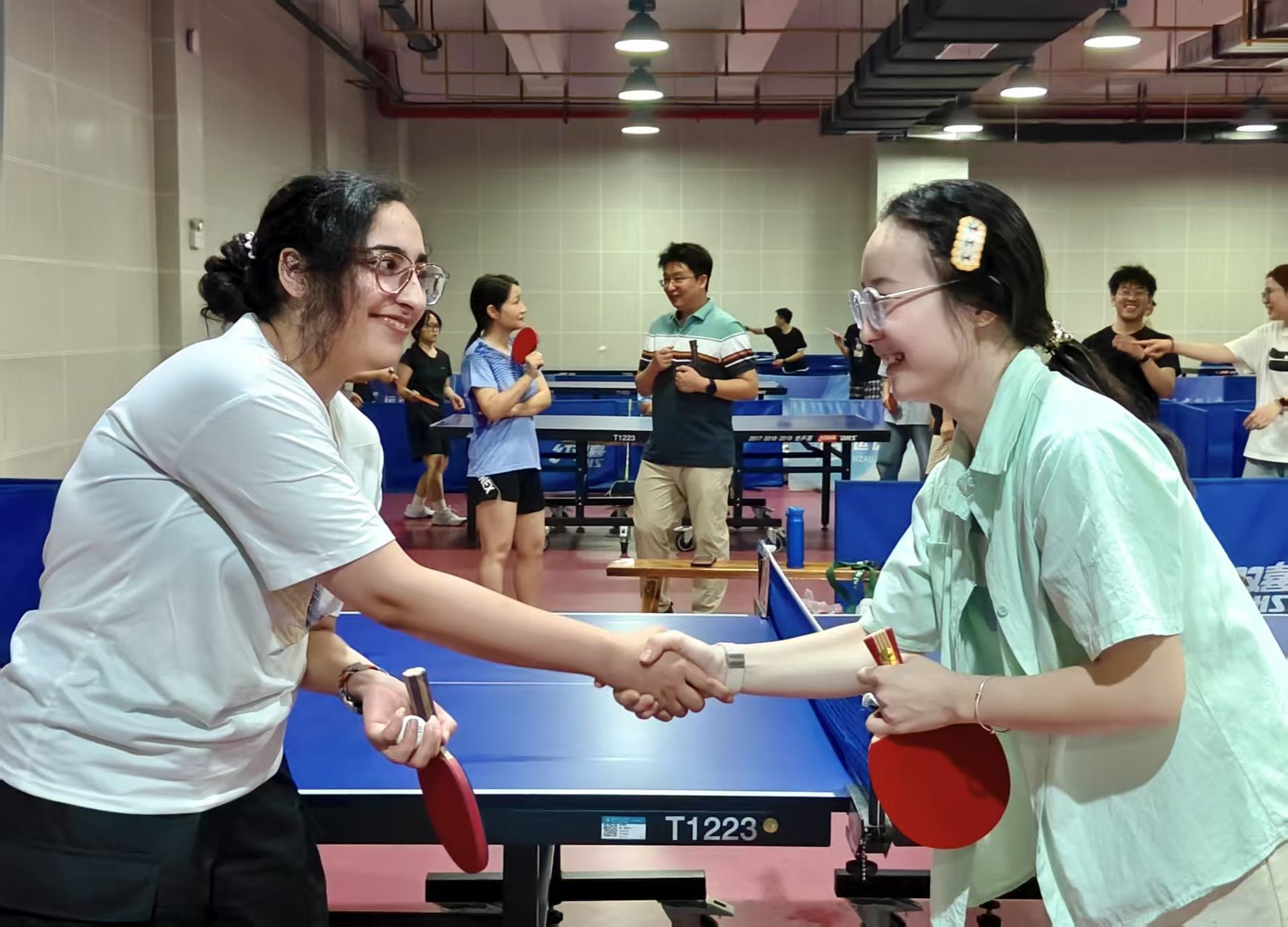 规则确定后,所有选手进行热身运动,以确保能够在比赛中发挥出最佳状态。比赛正式拉开帷幕,现场充满了欢声笑语和紧张的竞技氛围。本次乒乓球赛共进行了九局1v1对决,每场比赛都精彩纷呈,扣人心弦。选手们在场上全力以赴,挥洒汗水。观众席上不时传来阵阵喝彩,气氛十分热烈。
