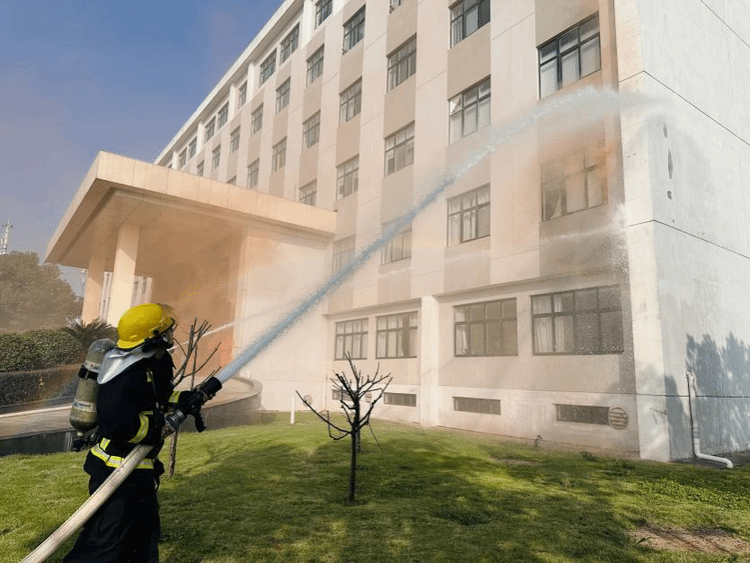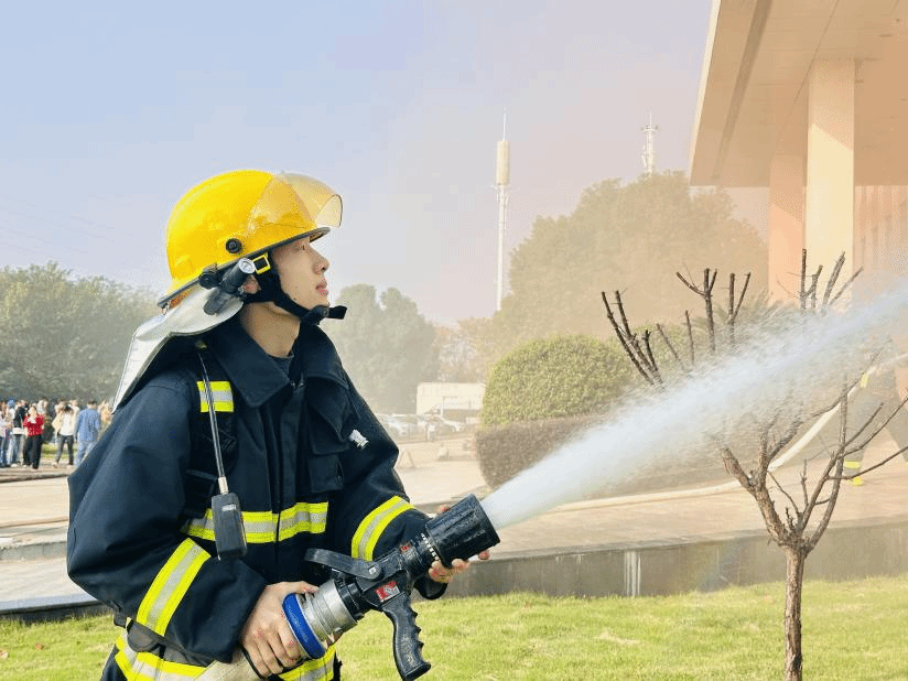 此次演练模拟生猪健康养殖协同创新中心二楼一实验室发生火情。伴随模拟烟雾逐渐蔓延,消防警报响起,楼内电源立即切断。各楼层安全疏散员迅速反应,有序引导师生用湿毛巾捂住口鼻,低姿弯腰,沿疏散标识安全撤离。整个过程组织有序、响应及时,楼内师生在很短时间内便安全疏散至楼前集结区。疏散过程中,校园消防队队员迅速使用水枪扑灭设置在二楼的烟雾弹,有效控制“火情”。