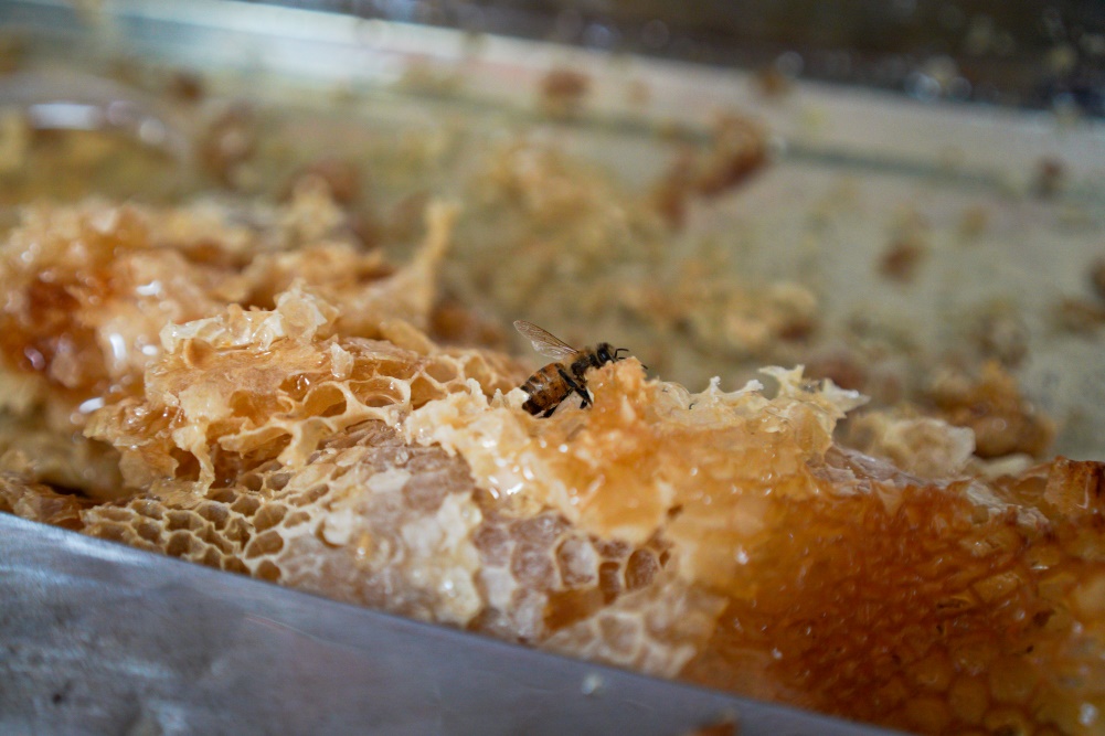 “好香啊,这是槐花的香味吗?”,“不对,我感觉是杏花。”随着蜂蜡割除,蜜香溢满了整间屋子,大家开始猜测蜜源。“这是万年青蜜,闻起来格外清香。”正在准备容器的冯小娟解释道。割下的蜂蜡沾着蜜,看到现场有人跃跃欲试准备一尝为快,协助王振摇蜜的秦旗旗表示蜂蜡可以用来做高级唇膏,而且口红原料就是蜂蜡,她建议大家咀嚼感受一下。果然,带着蜜汁的蜂蜡甜而不腻,口感像口香糖。蜂脾放入摇蜜机,粘稠的蜂蜜一点点被剥离下来,像是蜂蜜的毕业典礼,从此离开蜂脾进入容器。