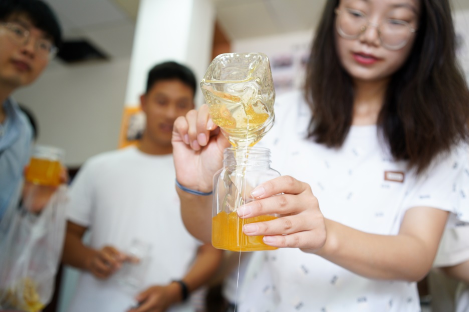 冲花粉、尝蜂蜜、人手一块蜂蜡皂……接下来的活动更像是“福利”,“蜂蜜有美容养颜的功效,而蜂蜡可入药,蜜蜂真得浑身是宝。”现场讲解人员解说到。品着甘甜的蜂蜜,现场有毕业生感慨这次活动很治愈充实。活动尾声,所有活动参与者进行了签名并合影留念。