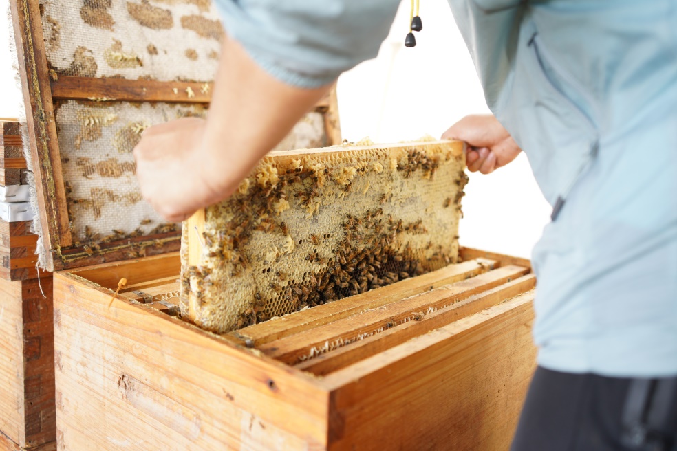“燃香主要是防止蜜蜂进攻,它们怕浓烟。一会开蜂箱的时候保持安静就好。”负责蜂场知识讲解的王振说道。香燃起来了,一只、两只……一群蜜蜂飞出蜂箱,烟雾中蜜蜂好像沾染了禅意,在王振娴熟的操作下,它们安静地分散在四周。