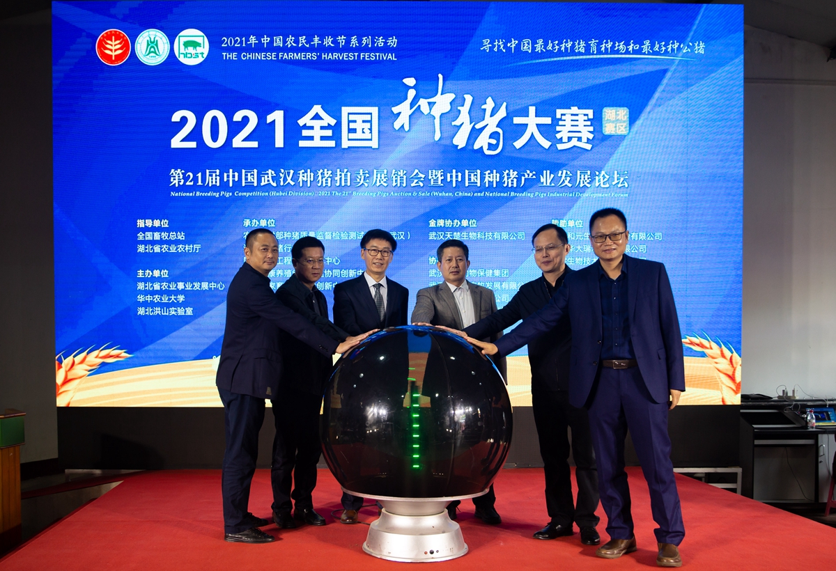 苏红田、易俊东、杨少波、雷贤忠等共同触摸水晶球,“2021年中国农民丰收节系列活动”全国种猪大赛(湖北赛区)正式开启。