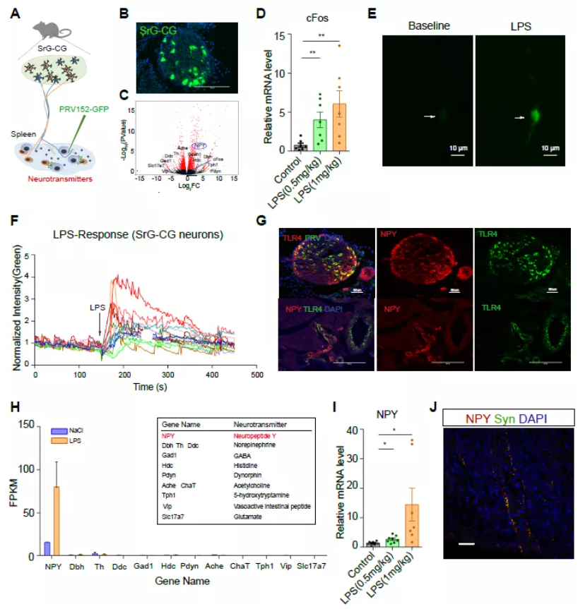 本研究首先利用伪狂犬病毒逆行追踪验证肾上-腹腔神经节(SrG-CG)到脾脏的神经通路。通过对 SrG-CG 的 RNA-seq 测序分析发现大鼠 SrG-CG 中含有丰富的 NPY+神经元。且 NPY 是所有神经递质中对 LPS 处理响应变化最显著的基因。