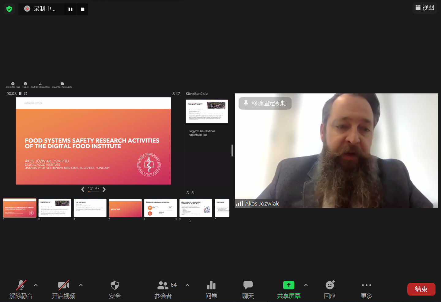 大会在2天内进行了13场报告。来自匈牙利布达佩斯兽医大学的Ákos Józwiak教授介绍了数字食品研究所的食品系统安全研究工作、新兴粮食系统风险识别和使用数据分析工具改进畜牧业实践,Tekla Engelhardt博士介绍了氧化还原电位测量作为一种快速微生物检测工具,Ákos Jerzsele副校长介绍了欧洲联盟在畜牧业中谨慎使用抗菌剂情况,Zoltán Somogyi助理教授介绍了药代动力学-药效学(PK/PD)分析在抗菌药物批准和使用中的作用,Ádám Kerek讲师介绍了动物源性兽药产品和食品中存在抗菌耐药基因的情况。