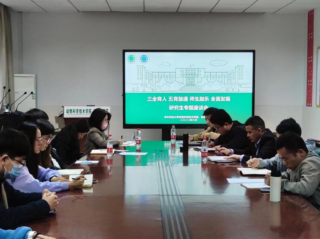 3月20日下午,学院在动科楼B105会议室举办以“三全育人、五育融通、师生融乐、全面发展”为主题的研究生专题座谈会。学院党委副书记代金贵、副院长彭贵青、研究生人才培养办公室教师代表及研究生代表参会。