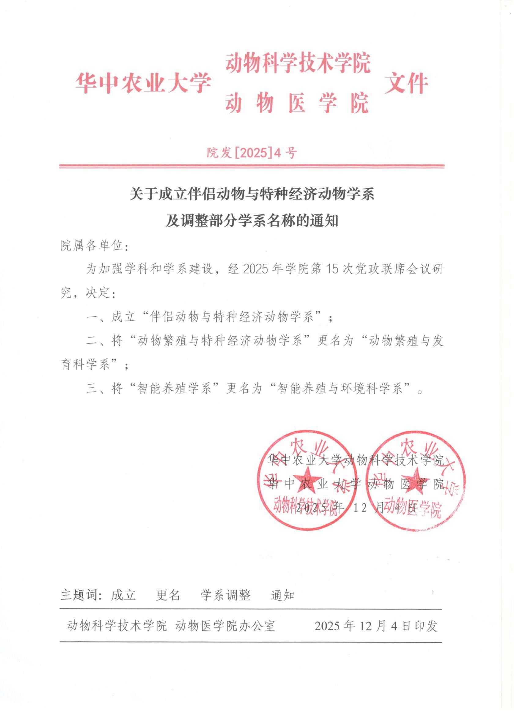 关于成立伴侣动物与特种经济动物学系及调整部分学系名称的通知