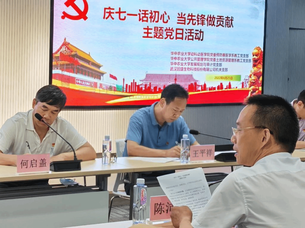 随后,三个联合党支部与武汉回盛公司机关支部在公司智能工厂共同开展以“庆七一话初心,当先锋做贡献”为题的校企主题党日活动。回盛公司机关支部书记陈沛风主持活动,并介绍公司机关支部建设和公司事业发展情况,重点介绍个人参加革命红色胜地瑞金培训学习的心得体会。参加活动的三个校方党支部书记分别介绍支部党建情况,均表态加强党建决心,牢记初心,永远跟党走,强强联合,促进校企合作,为中国梦做贡献。预防兽医学系教工第二党支部书记何启盖教授指出,企业发展需要党员的先锋模范带头作用。学校发展规划与审计党支部书记王平祥强调,政治铸魂,牢记党纪,传承红色基因,加强应用型人才培养。