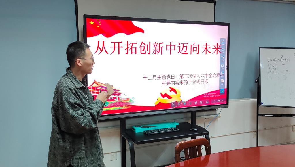 会议伊始,支部书记侯运卿同志带领大家从五个方面深入学习主题“从开拓创新中迈向未来”的重要意义:中国共产党高度重视总结历史经验;开拓创新既是中国共产党在逆境中锻造的品质,也是其胜任救亡与强国使命的关键所在;开拓创新之于中国共产党的价值,已经被历史所充分证明;进入新时代,着眼现实与未来,开拓创新也仍体现为中国共产党治国理政的重要理念,为不断释放内蕴于中国之制的潜力创造条件;中国共产党坚持开拓创新的新要求。