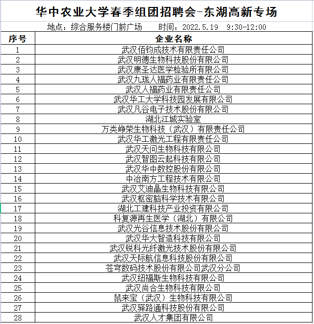 5月19日上午东湖高新专场招聘会,综合事务大楼门口9:30开始