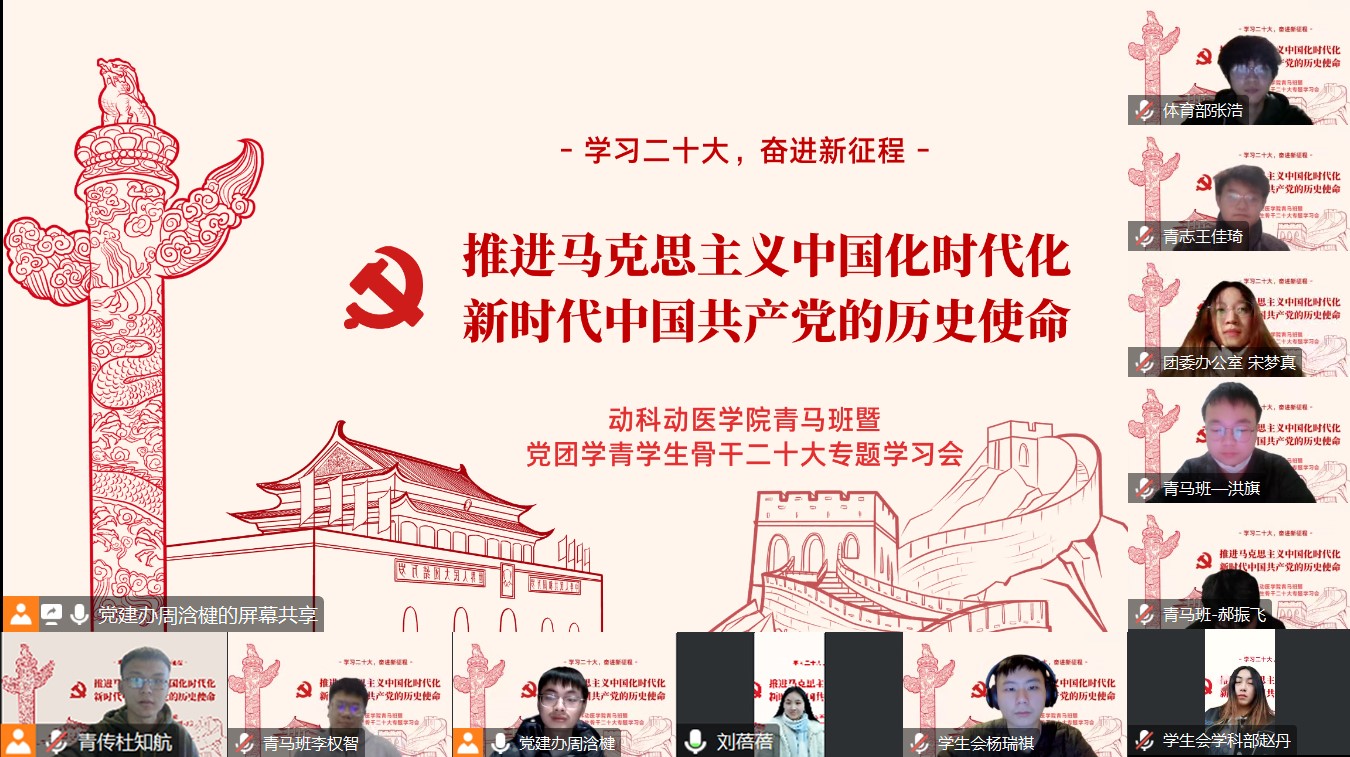 (通讯员:杜知航)1月10日晚,动科动医学院青马班针对“推进马克思主义中国化时代化”和“新时代中国共产党的历史使命”等主题组织专题研讨。本次会议采取线上学习模式,学院第二期青马班成员和党团学青骨干参与学习,线上阅读原文,分享心得。