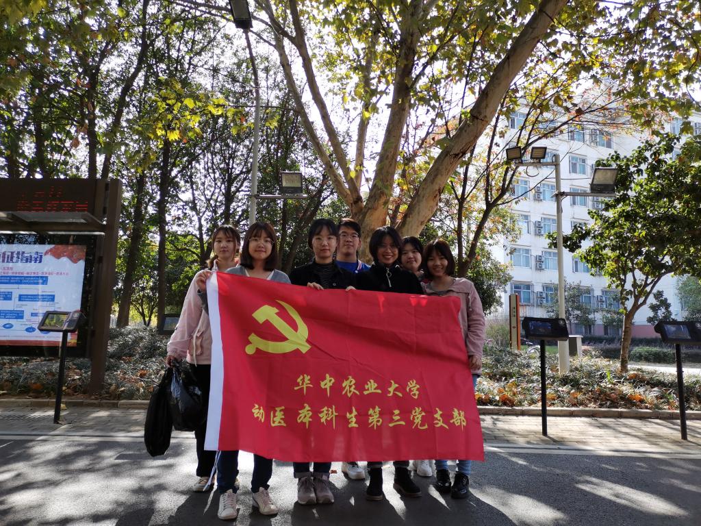 (动科动医学院通讯员 杨程 供图 杨程 潘文雅)11月15日(星期五)中午12点20分,动科动医学院动医本科生第三支部在校内南湖旁开展了“志愿服务党员先行”主题实践活动,活动由动医第三支部书记杨程组织策划,动医本科生第三党支部全体在校成员参与了本次实践活动。