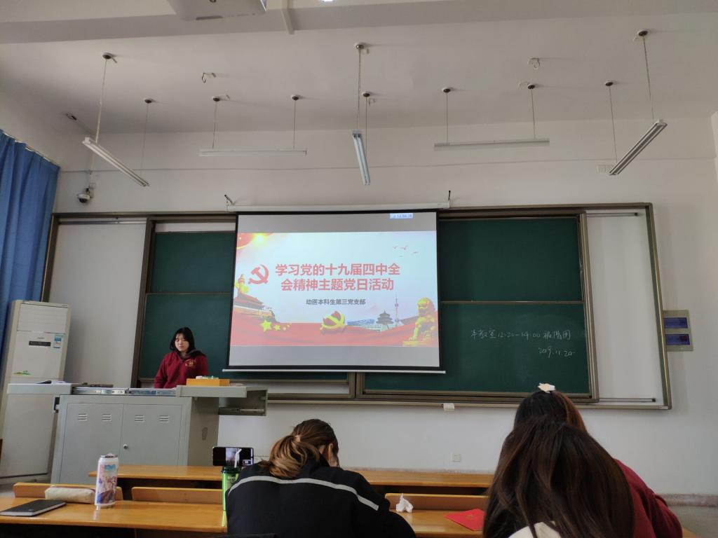 (动科动医学院通讯员 杨程 供图 尹瑞玲)11月20日(星期三)中午12点20分,动科动医学院动医本科生第三支部在第四教学楼c402开展了“学习十九届四中全会精神”主题党日活动,活动由动医第三支部书记杨程主持,动医本科生第三党支部全体成员出席了本次活动。