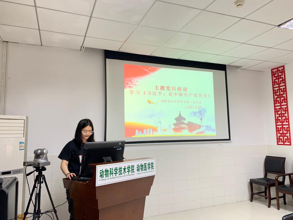 (通讯员 李甜)4月20日,动科动医学院预防兽医学研究生第一党支部在动科楼B105开展了深入学习《习近平:论中国共产党历史》的主题党日活动,活动由支部书记邰蓉同志主持,全体支部党员参加。