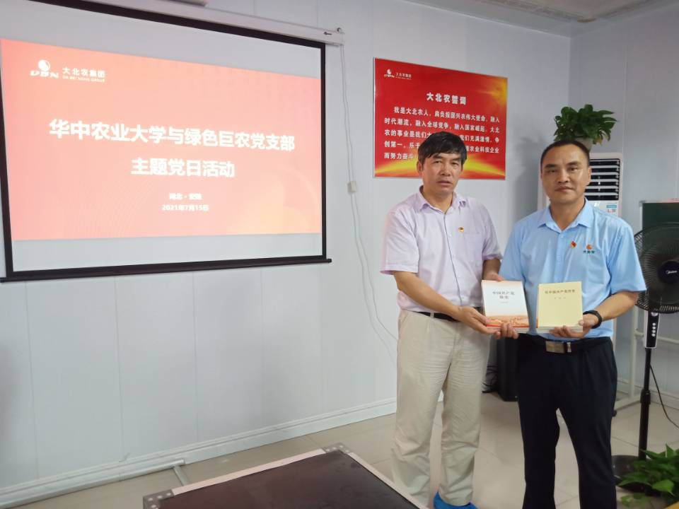 在交流的过程中,何启盖教授也分享了作为一名优秀共产党员的经历与经验,积极重申和倡导巨农充分发挥共产党员的先锋带头作用,让党的力量在“复盘和生产”中发扬光大,进一步推动巨农做大做强。最后,何启盖书记专门将党史学习资料捐赠予彭承平书记,希望加强校企深度合作,共建共赢。