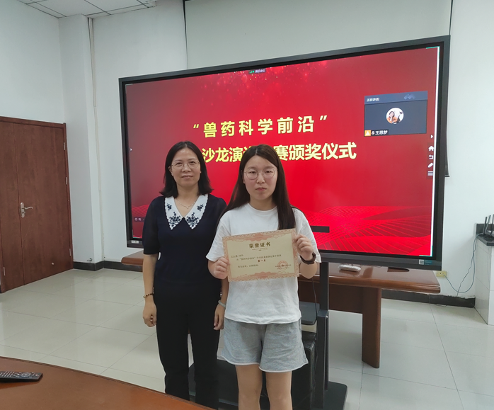 会议第四项,陈惠同学宣读“兽药科学前沿”学术沙龙演讲比赛的结果,并由黄玲利老师、王旭老师和彭大鹏老师分别对获得一、二和三等奖的同学进行颁奖。学术沙龙演讲比赛的举办丰富了同学们的科研生活,也是对大家在学习道路上辛勤付出的肯定。