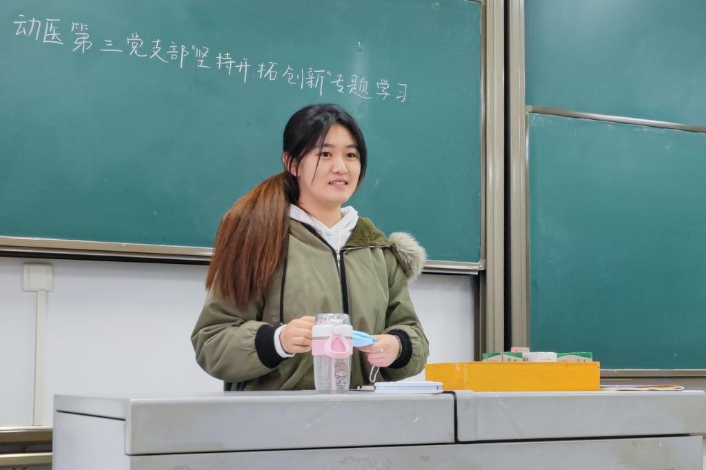 “十八大以来,创新始终位于国家发展全局的核心位置。”动医第三党支部缪笑语强调创新的重要地位,指出:“创新是引领发展的第一动力,我们要将开拓创新融入到我们学习工作、谋事创业中,争做优秀科技创新型人才。”