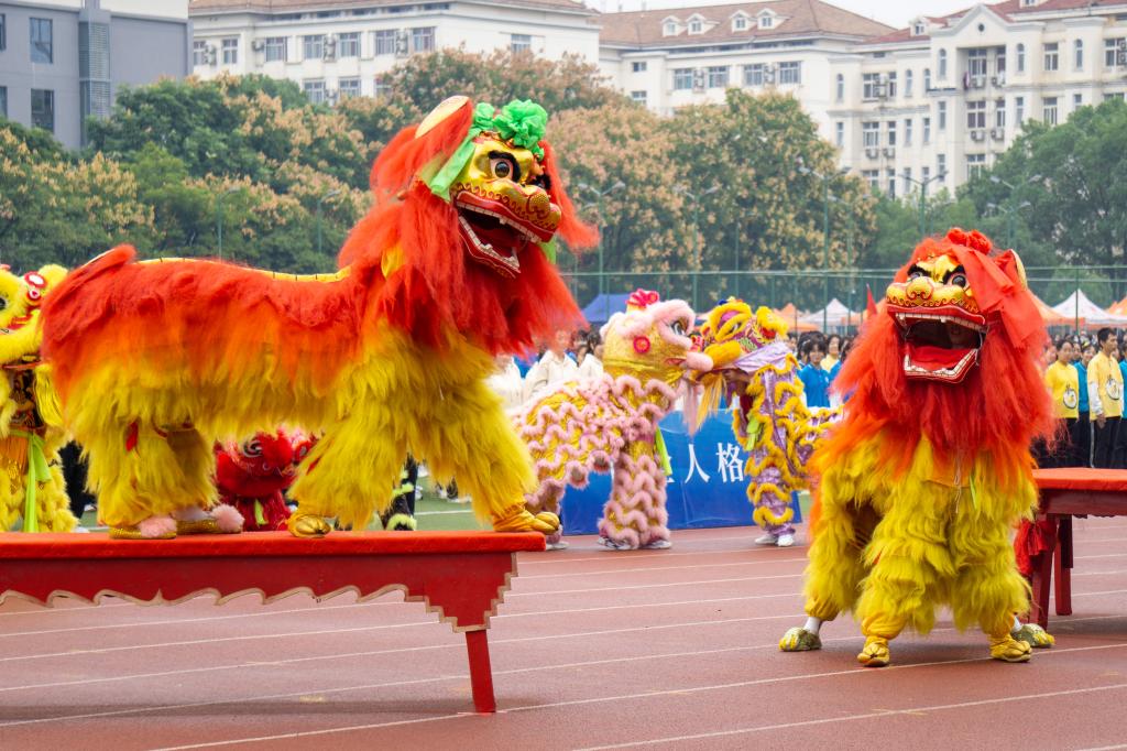 鼓声强劲有力,八只醒狮威风凛凛、活灵活现,精彩的表演赢得了在场观众热烈的掌声。运动会开幕式在全场观众的欢呼声中拉开了序幕。紧接着,由14个学院一千六百八十名广播操队员带来的第九套广播体操表演开始了。秋雨如绵,动科动医学院队员身着藏青色短袖院服,动作整齐划一,活力满满。灿烂的笑容是他们对未来的期待和憧憬,也展现着狮山学子蓬勃而又激情的热血青春。