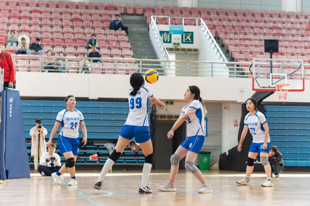 下午14点30分,随着裁判员鸣哨,比赛正式开始。动科动医女排开球,排球腾空而起,双方球员屏住呼吸,紧盯排球走向,整个球场弥漫着紧张的气氛。随着“嘭”一声排球落地,裁判吹哨,动科动医学院拿下本场比赛第一分,赢得全场欢呼喝彩。延续良好状态,动科动医学院精准预判、迅猛发球、巧妙吊球,凭借着默契的配合接连得分,将比分拉大至15:6。园林女排不甘落后、积极追赶,但奈何动科动医女排攻势猛烈、防守过硬,最终,动科动医学院以25:9拿下第一局比赛。