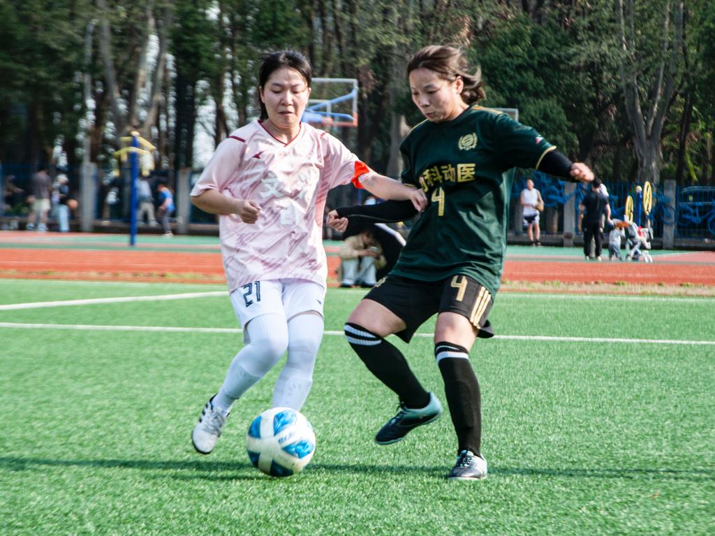 比赛伊始,动科动医学院队因文法学院队犯规获得任意球机会,22号车文萱主罚任意球,11号许文诺头球进攻遭文法学院队守门员拦截,未能改写比分。动科动医学院队院始终保持紧密的进攻节奏,文法学院队全力构筑防线、抵御攻势。经过激烈的角逐,双方都展现出了强大的实力,但在僵持中仍未能打破平局,上半场比赛以0:0告终。