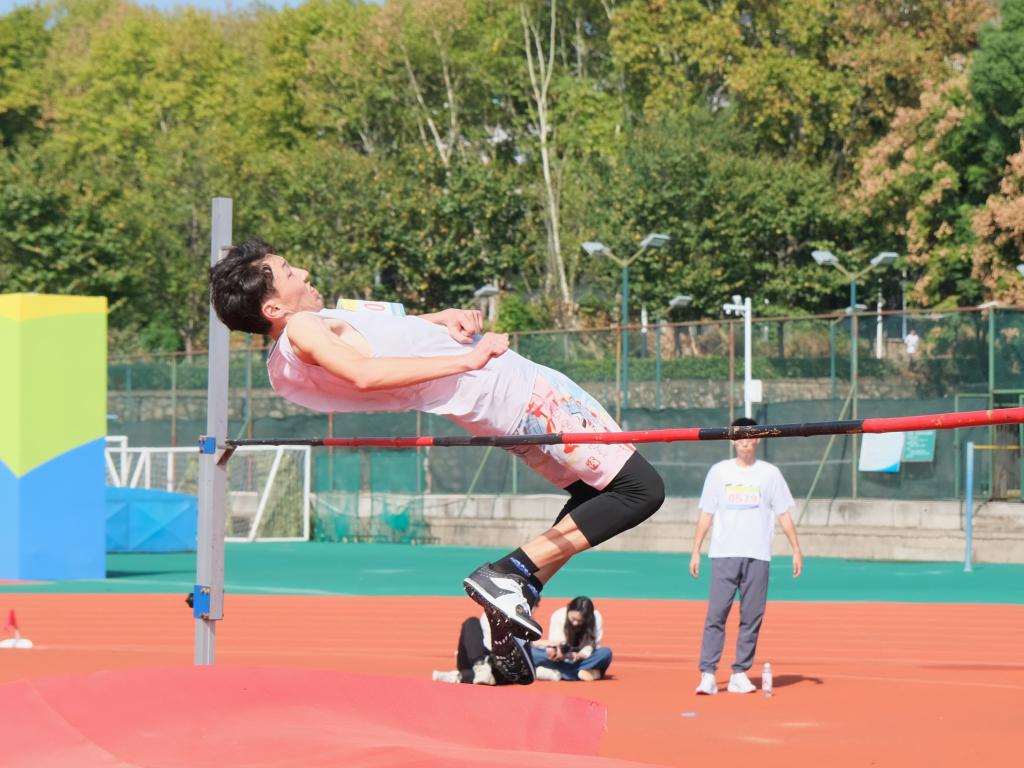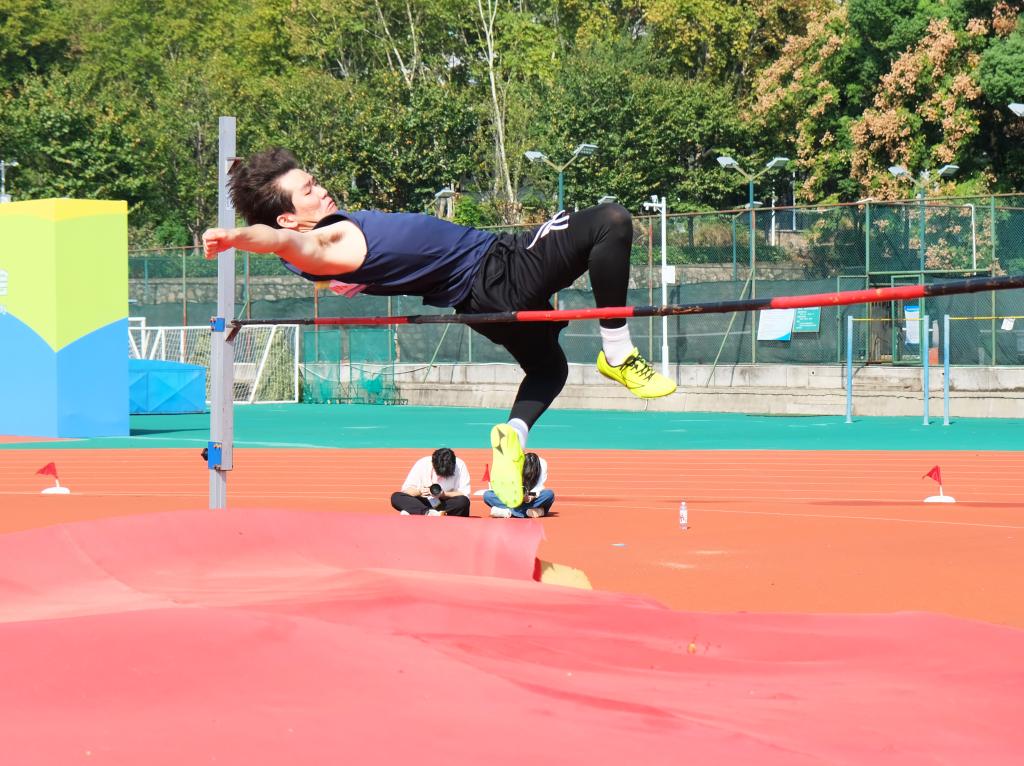 在烈日炎炎之下,跳高赛场上的气氛紧张而热烈。随着跳高杆的不断升高,选手们的斗志也愈发昂扬,激情在每个人的心中熊熊燃烧。顾海昕与赛力克江·达吾列提巴依,这两位号码紧邻的健儿,仿佛是对“动科动医,永创第一”精神风貌的完美接力。他们深呼吸,调整状态,目光紧锁横杆,精确测量步伐,随后如离弦之箭般助跑而出,转身起跳,身姿轻盈矫健,如同翱翔天际的雄鹰,在空中划出一道道优美的弧线,最终以1.55米的佳绩,完美展现了动科动医学子的青春活力与卓越风采。