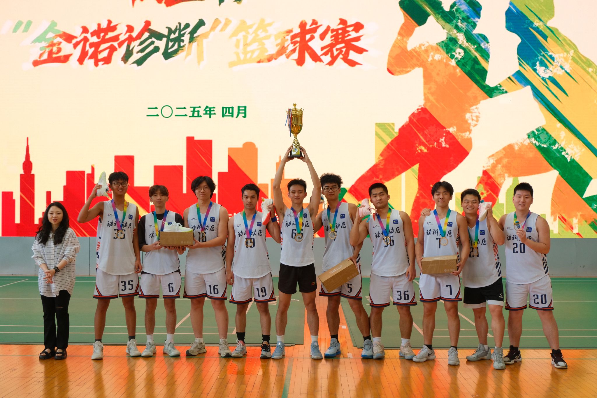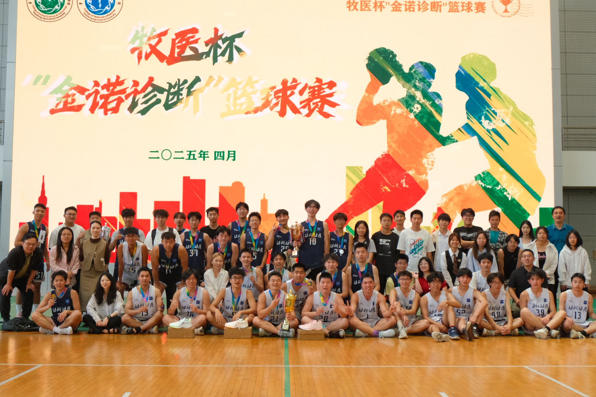 颁奖仪式环节,北京金诺百泰生物技术有限公司市场总监金卉为冠军队伍颁奖,动科动医学院党委副书记杨冬凯分别为亚军和季军队伍颁奖。颁奖仪式结束后,全体参赛队员合影留念,为本届牧医杯“金诺诊断”篮球赛画上圆满的句号。