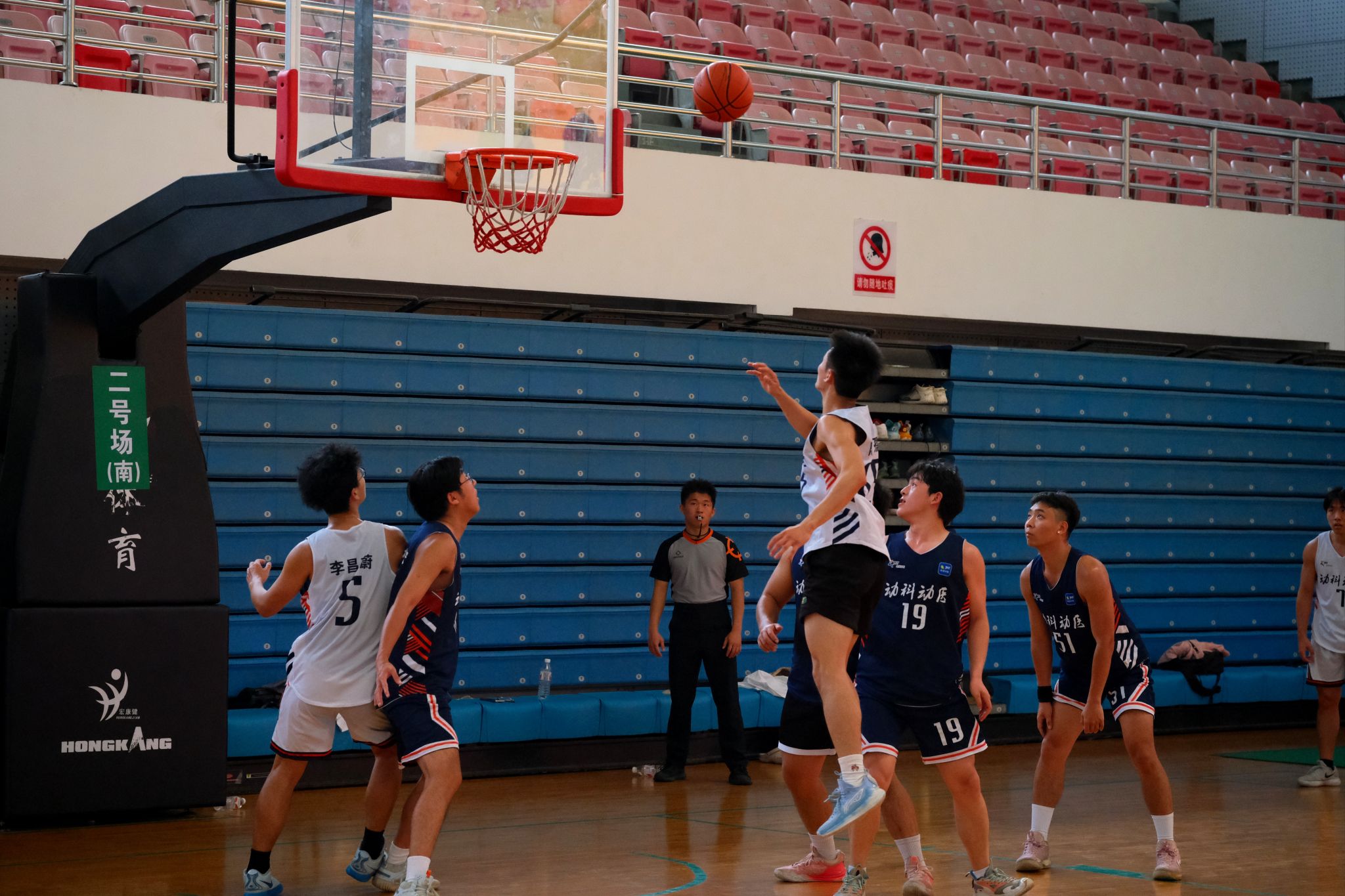 随着裁判一声哨响,二号场22-24级动医5、6班联队(白队)与21级2、4、6、8班联队(黑队)展开冠军角逐。首节比赛中,白队凭借稳定发挥,始终保持微弱领先。比赛进行至中段,黑队1号翁古吉昌抓住关键罚球机会,两罚全中帮助黑队实现比分反超。关键时刻,白队65号陈子孺连续得分,重新夺回领先地位。首节战罢,白队以11:10的比分暂时领先。