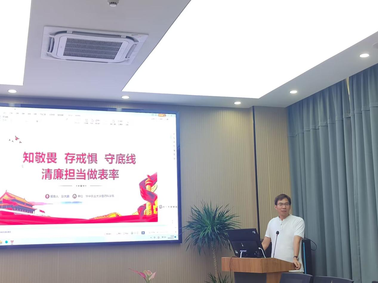 最后,兽药科学系教工党支部纪检委员彭大鹏老师为大家做了一场题为“知敬畏、存戒惧、守底线,清廉担当做表率”的廉政党课。彭老师强调:“关于全面从严治党,我们每个党员心里都要有一道尺,严格遵守党章,增强纪律意识,形成遵纪守规的高度自觉。”